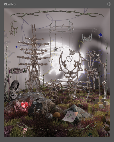 Rewind nos revela uma profusão de símbolos organizados em um ambiente estéril, fechado e com iluminação controlada. Ao observar os detalhes, é possível notar objetos como um desenho de criança, um coração que irradia uma luz vermelha, pequenas estrelas azuis e até um móbile, formando uma composição com itens que parecem ter sido retirados de uma memória de infância e colocados à luz de uma observação científica.